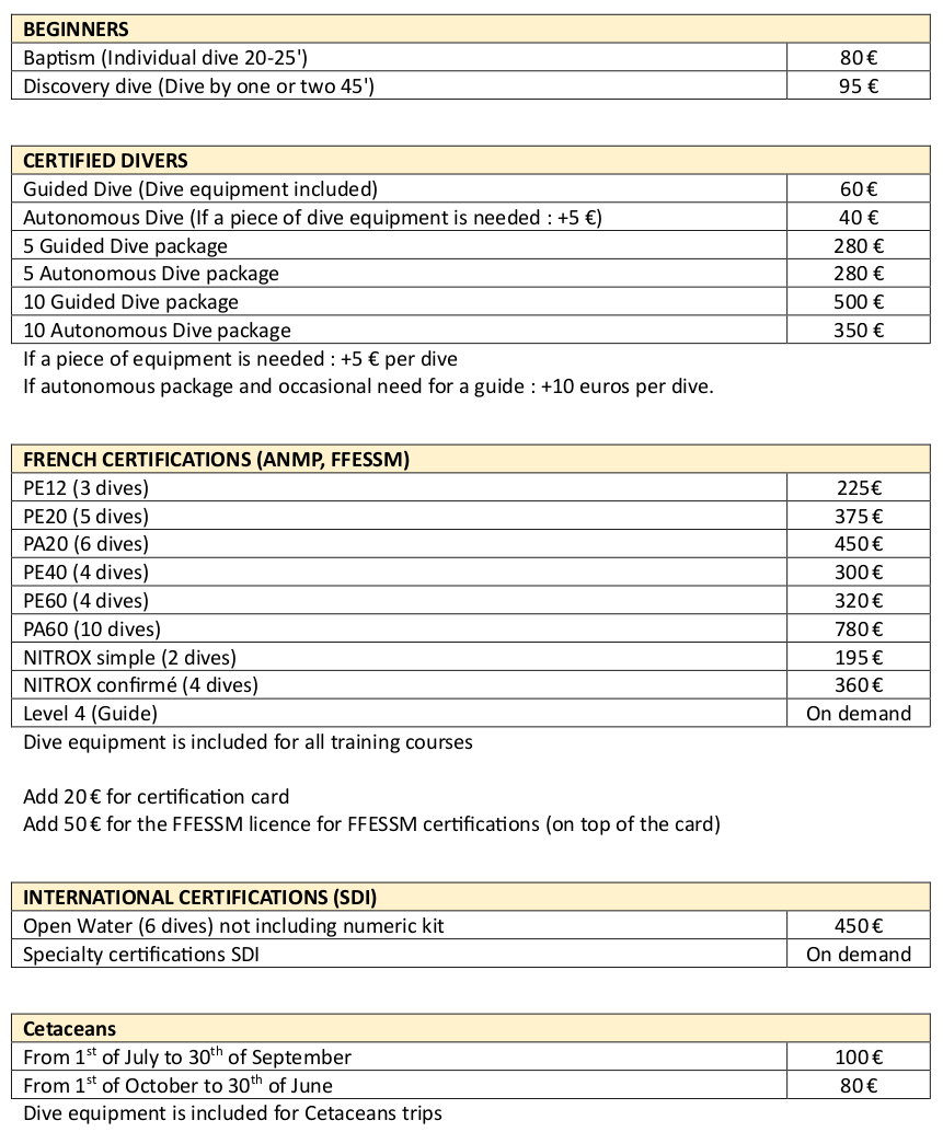 His specialty, aside from his technical skills which allow him to train and supervise dives to 60m, is teaching. No phobia can resist to him. Diving always ends with smiles… Yours… and his.